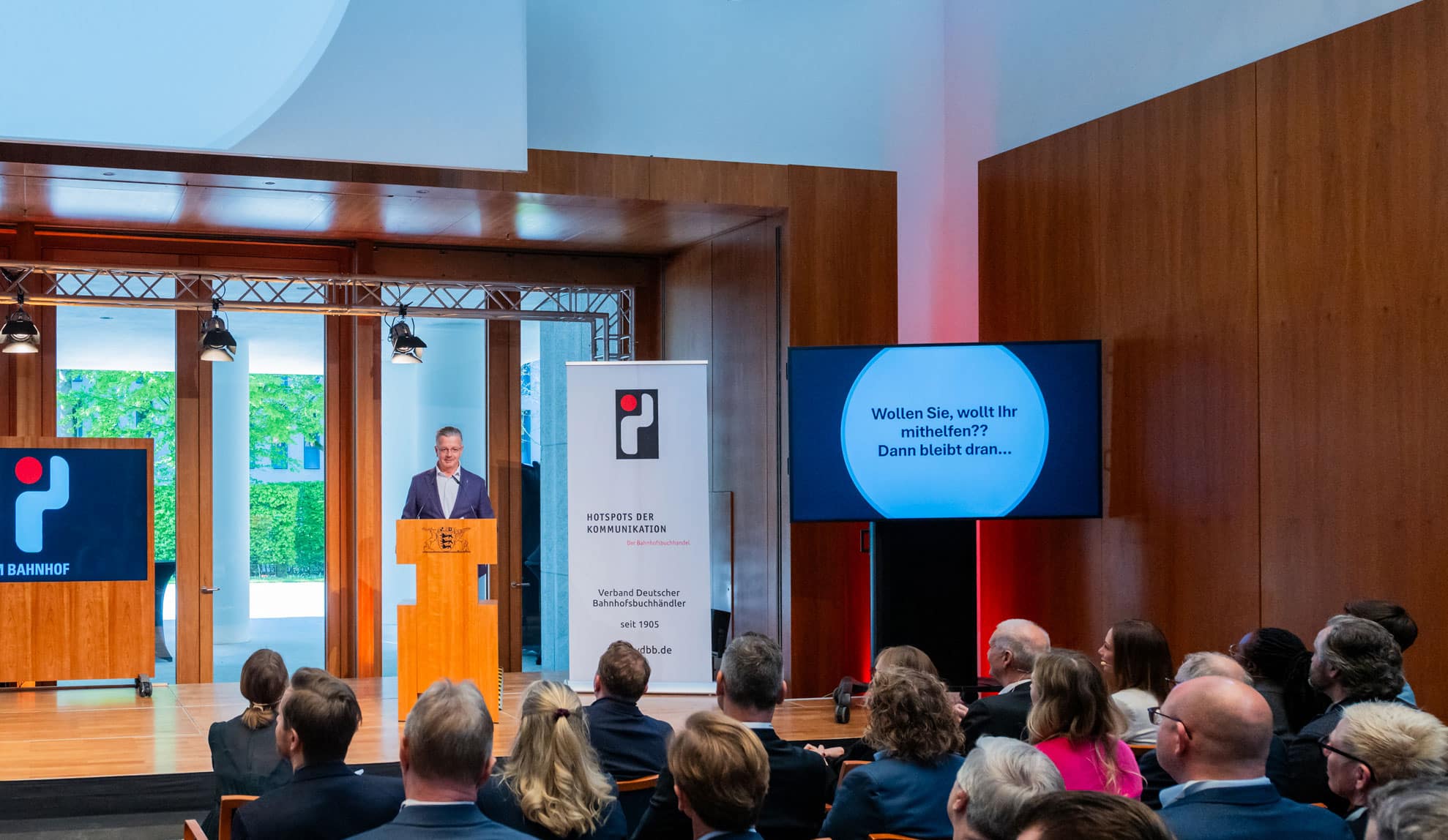 Die Vertretung des Landes Baden-Württemberg im Botschaftsviertel am Berliner Tiergarten war 2026 wieder der Schauplatz der Jahrestagung des Verbandes Deutscher Bahnhofsbuchhändler. Unweit des Regierungsviertels traf der Bahnhofs- und Flughafenbuchhandel auf Führungskräfte aus Medien- und Vertriebsunternehmen. Rund 240 Gäste waren vor Ort.