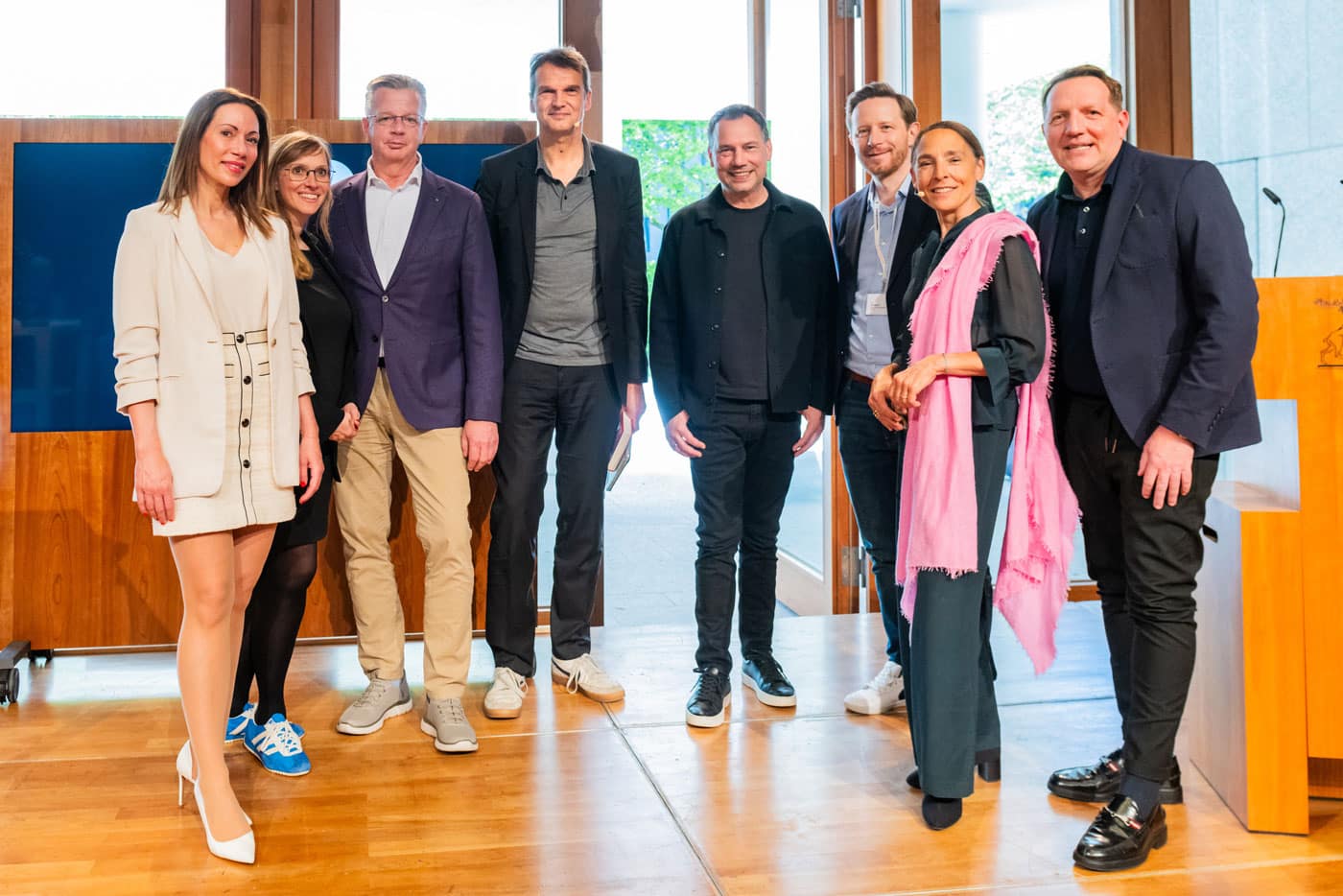 Mitwirkende auf der Jahrestagung des Verbandes Deutscher Bahnhofsbuchhändler: v.l. Anja Katharina Bezold, Sarah v. Nordheim, Torsten Löffler, Klaus Brinkbäumer, Sebastian Fitzek, Matti Eckert, Andrea Thilo, Daniel Seidl. Foto: Sandwichpicker-berlin.com/ Ole Bader